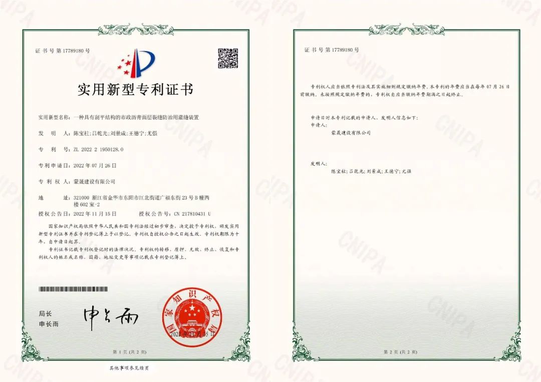 近日,蒙晟公司荣获“一种具有刮平结构的市政沥青面层裂缝防治用灌缝装置”新型专利,该专利获得了国家知识产权局颁发的《实用新型专利证书》。当前市政道路建设,主要以沥青道路为主,在使用过程中会产生不同程度的裂缝问题,严重影响道路美…