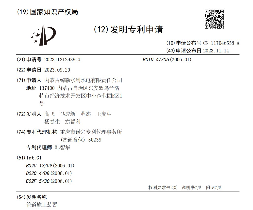 蒙水股份绰勒公司高飞、马成新、苏杰、王虎生、杨春生、袁哲利研发的“一种水利管道施工装置”成功获得了国家知识产权局颁发的发明专利证书。该装置具有操作简便、施工效率高、降低劳动强度、节省施工成本等优点,为水利管道施工提供了全新的…